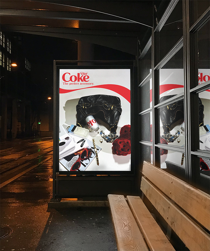 This proposed ad campaign for Diet Coke celebrates Coca Cola’s timeless legacy. No matter the consumer, its the perfect accessory for any time, any look, any place.