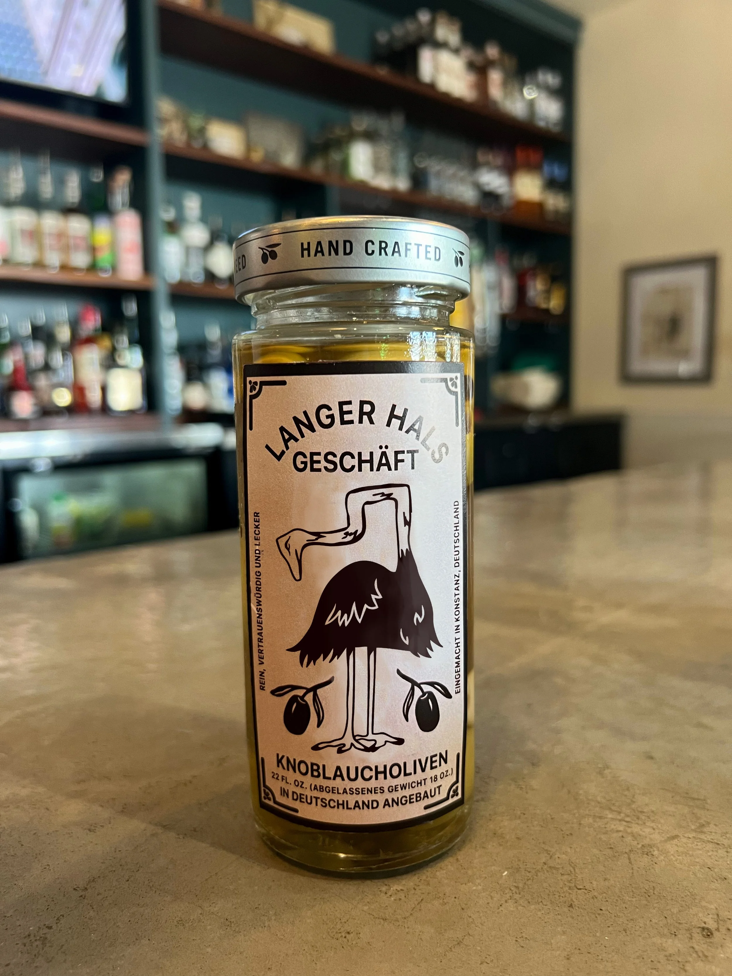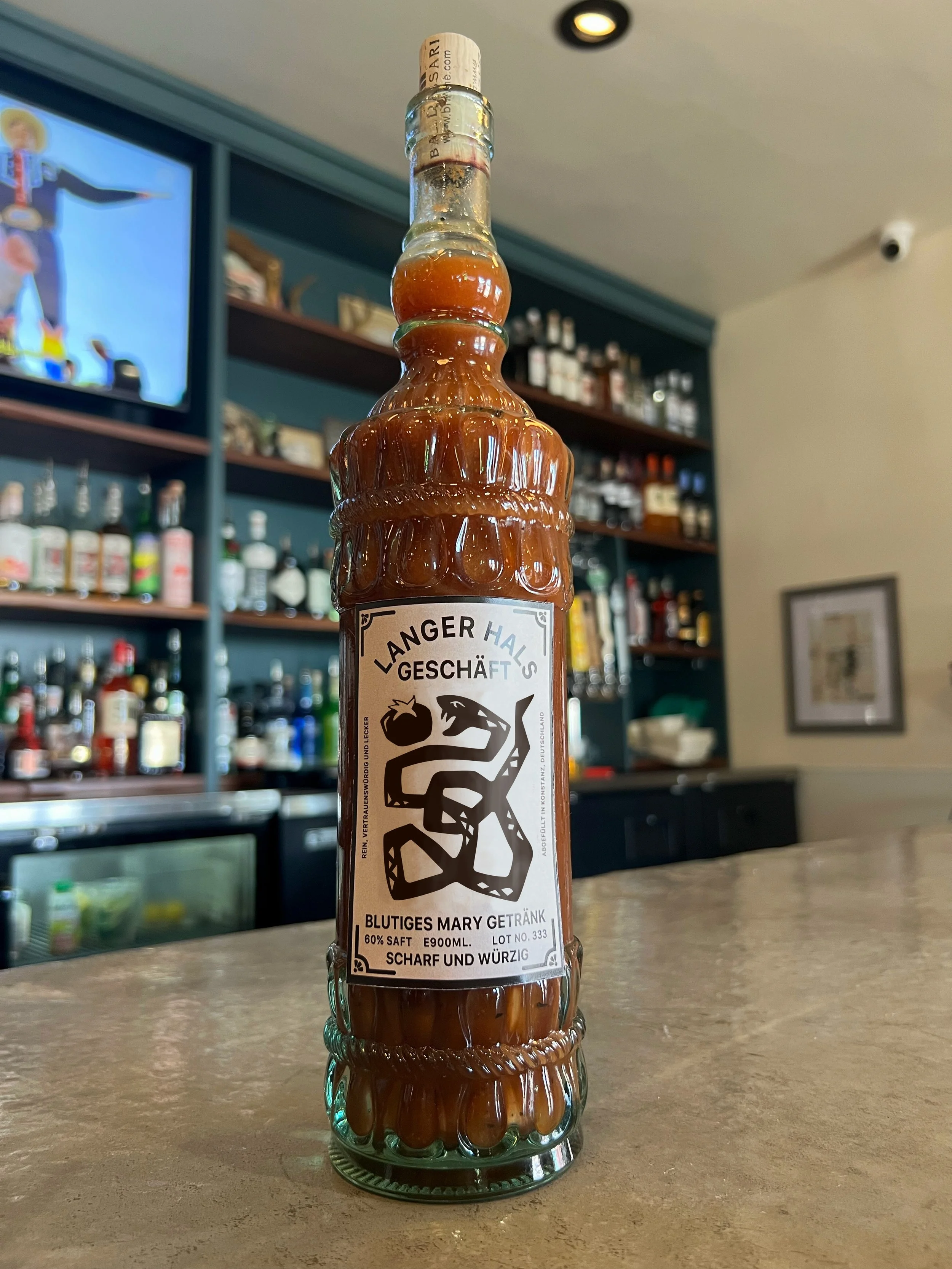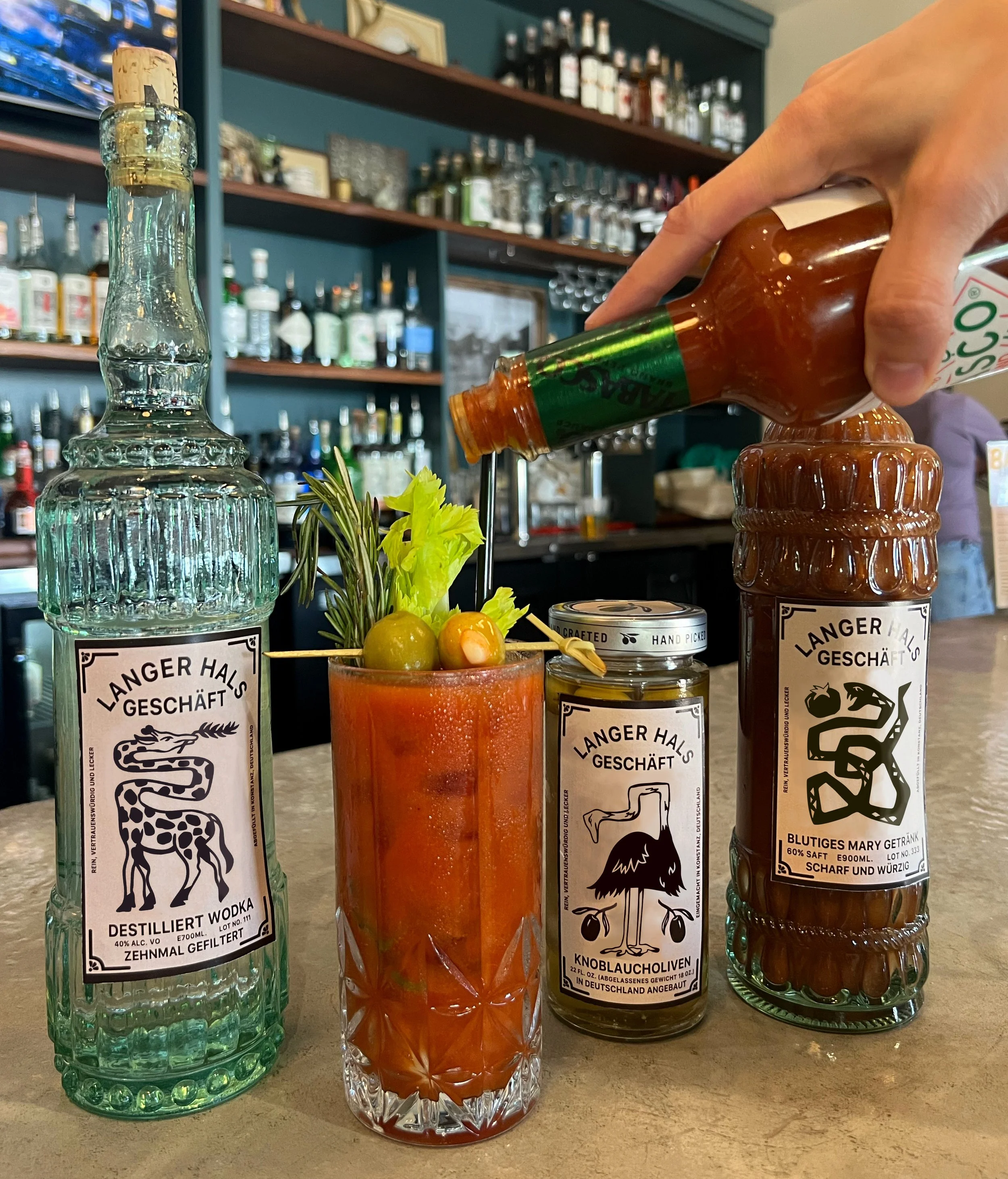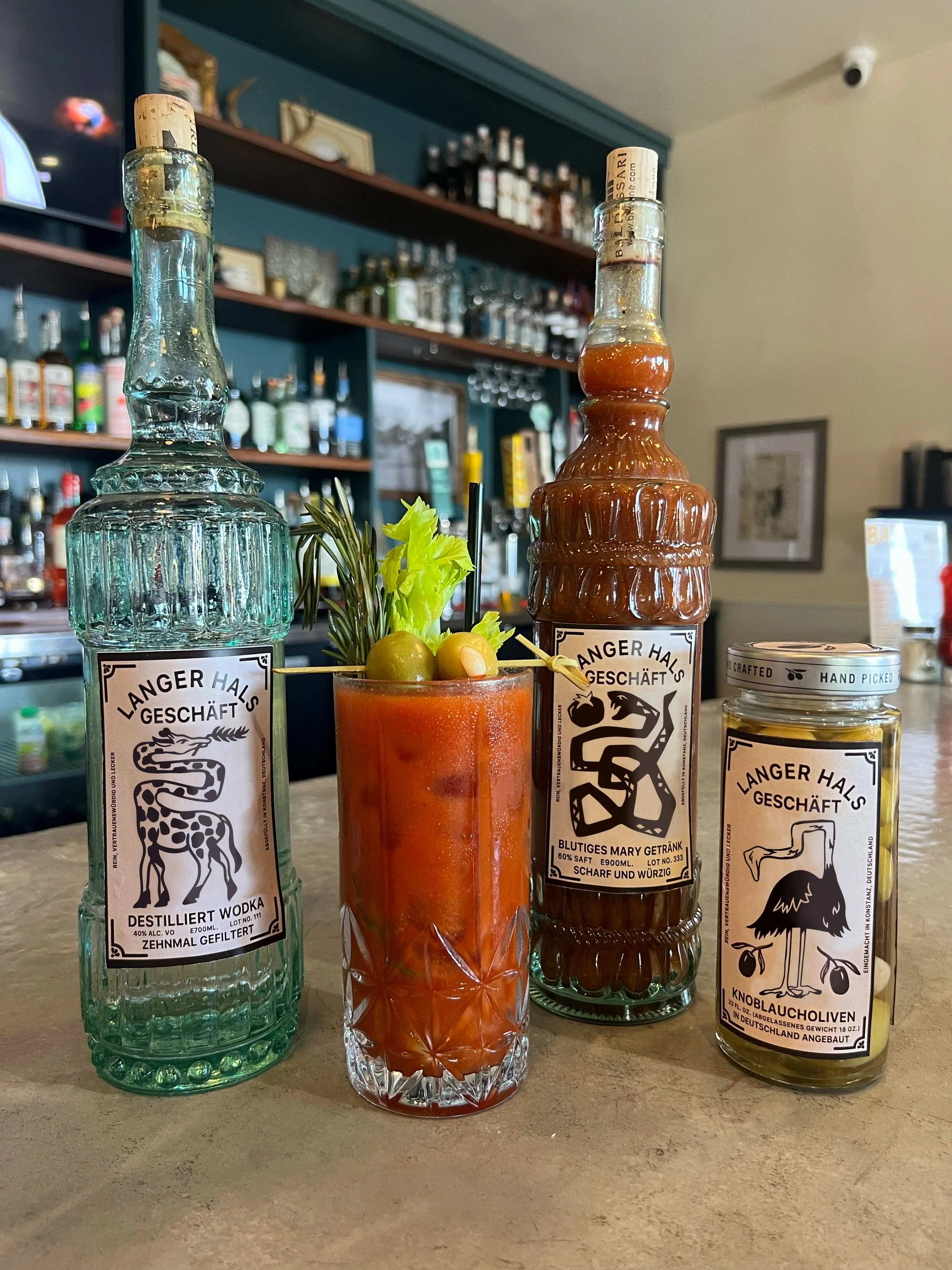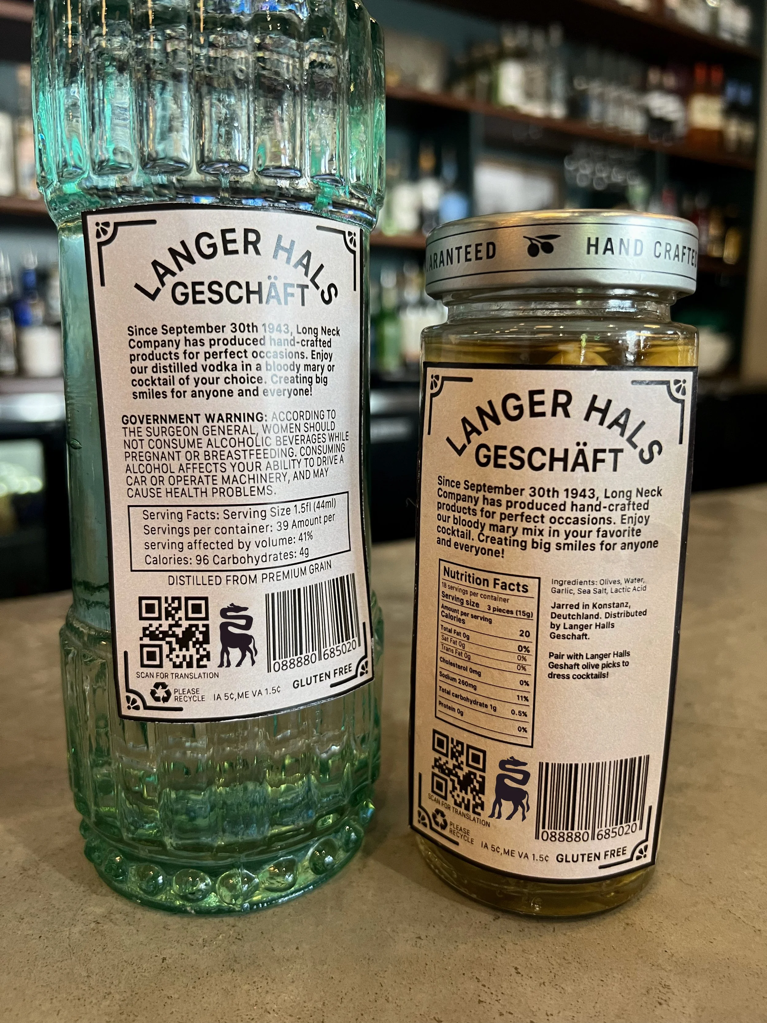 (Long Neck company) is a liquor and mixer brand based in Konstanz, Germany specializing in vodka spirits and canned goods. Based on a Bloody Mary cocktail set, this package includes vodka, spicy tomato mix, and jarred olives. See the QR code on the label for translation and sale in different countries.