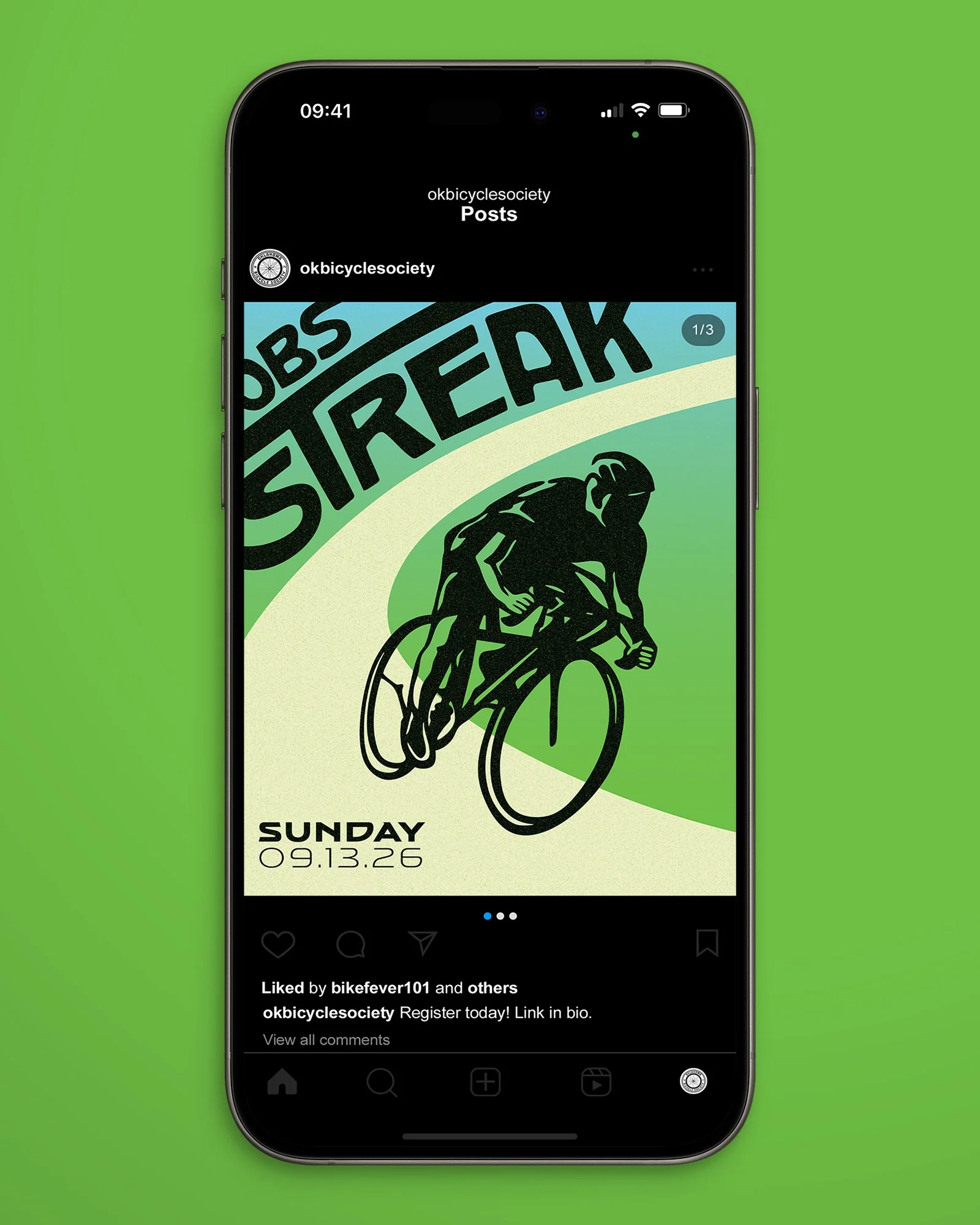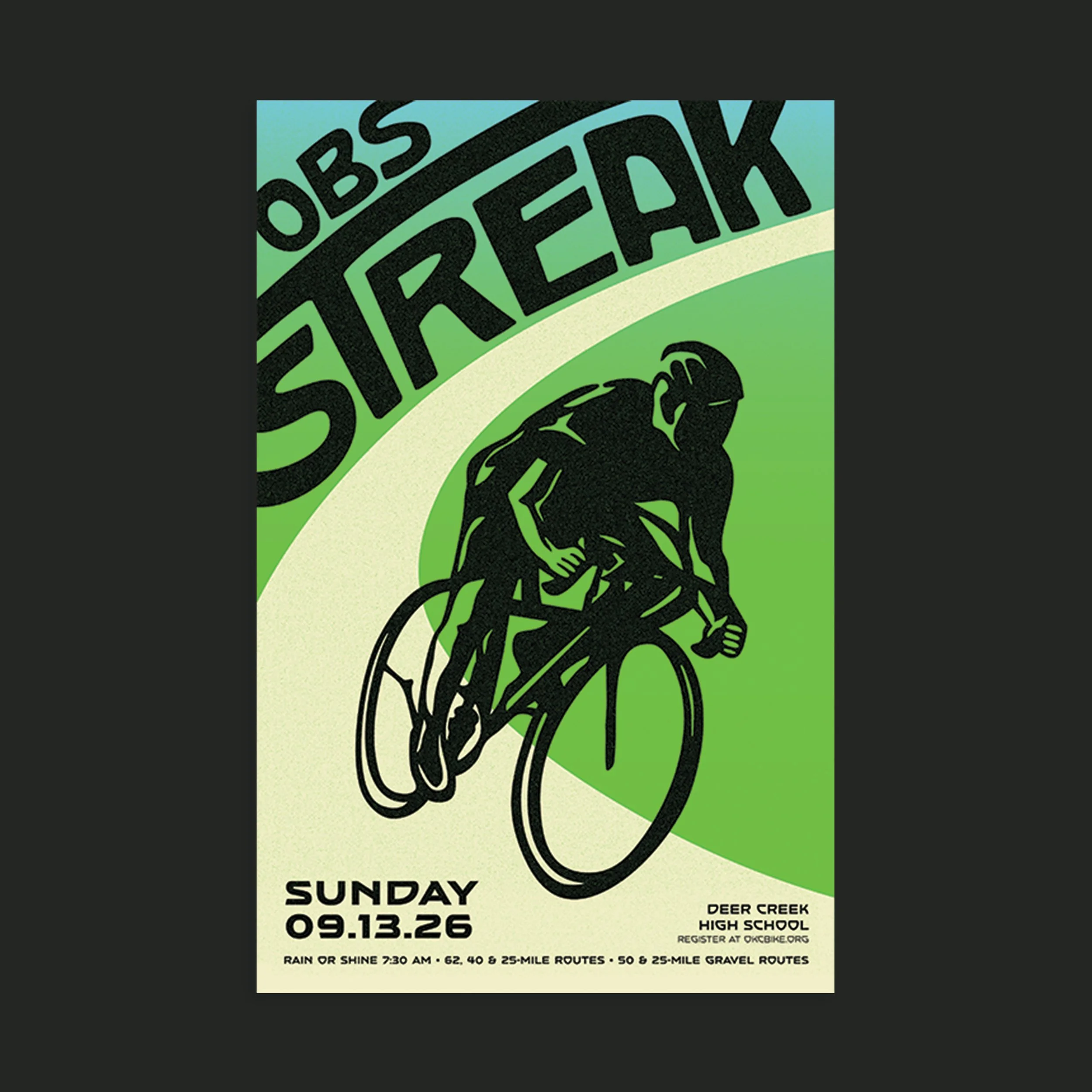 Branding for Oklahoma Bicycle Societies “STREAK”, an annual biking event in Oklahoma City. Created and chosen for production out of student projects for Inktank Studio.
