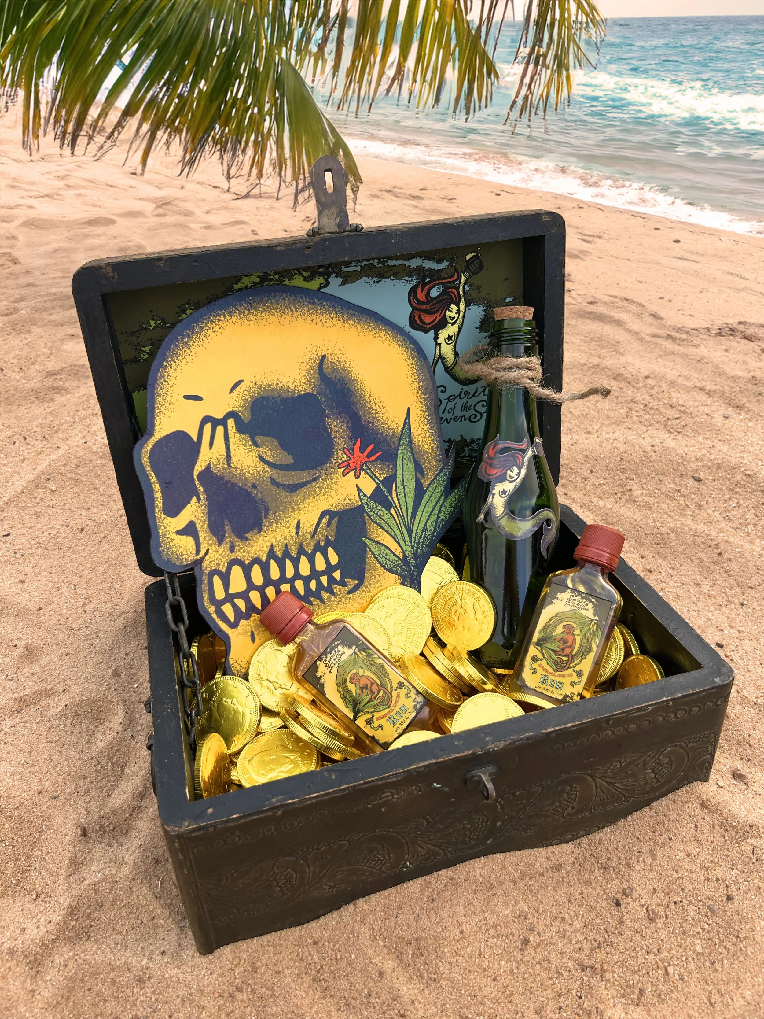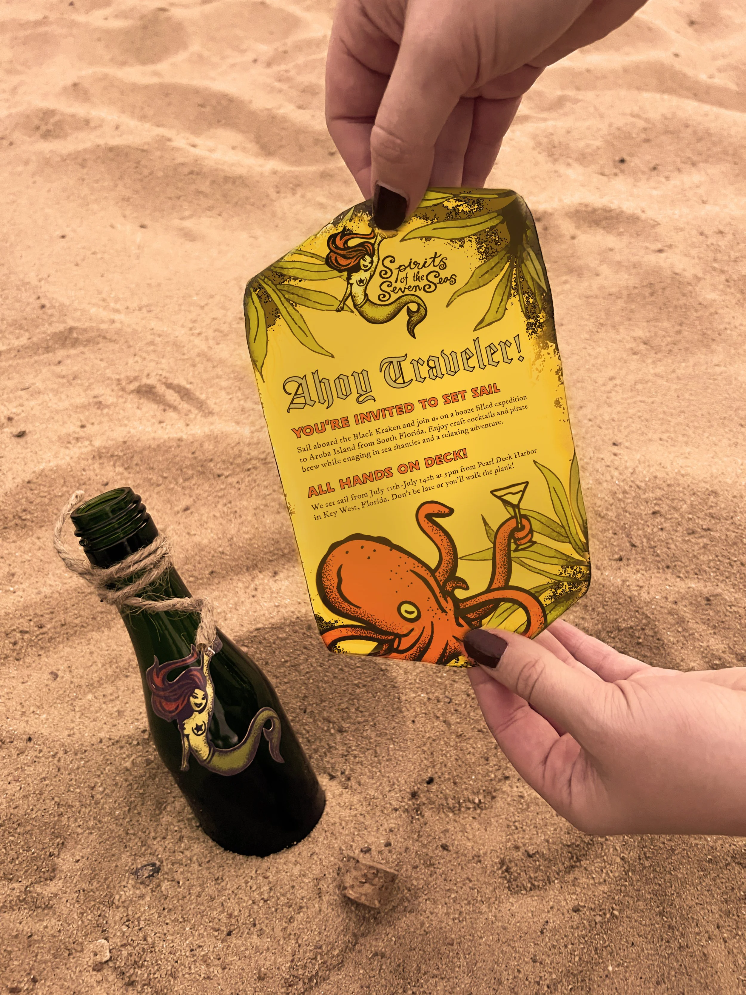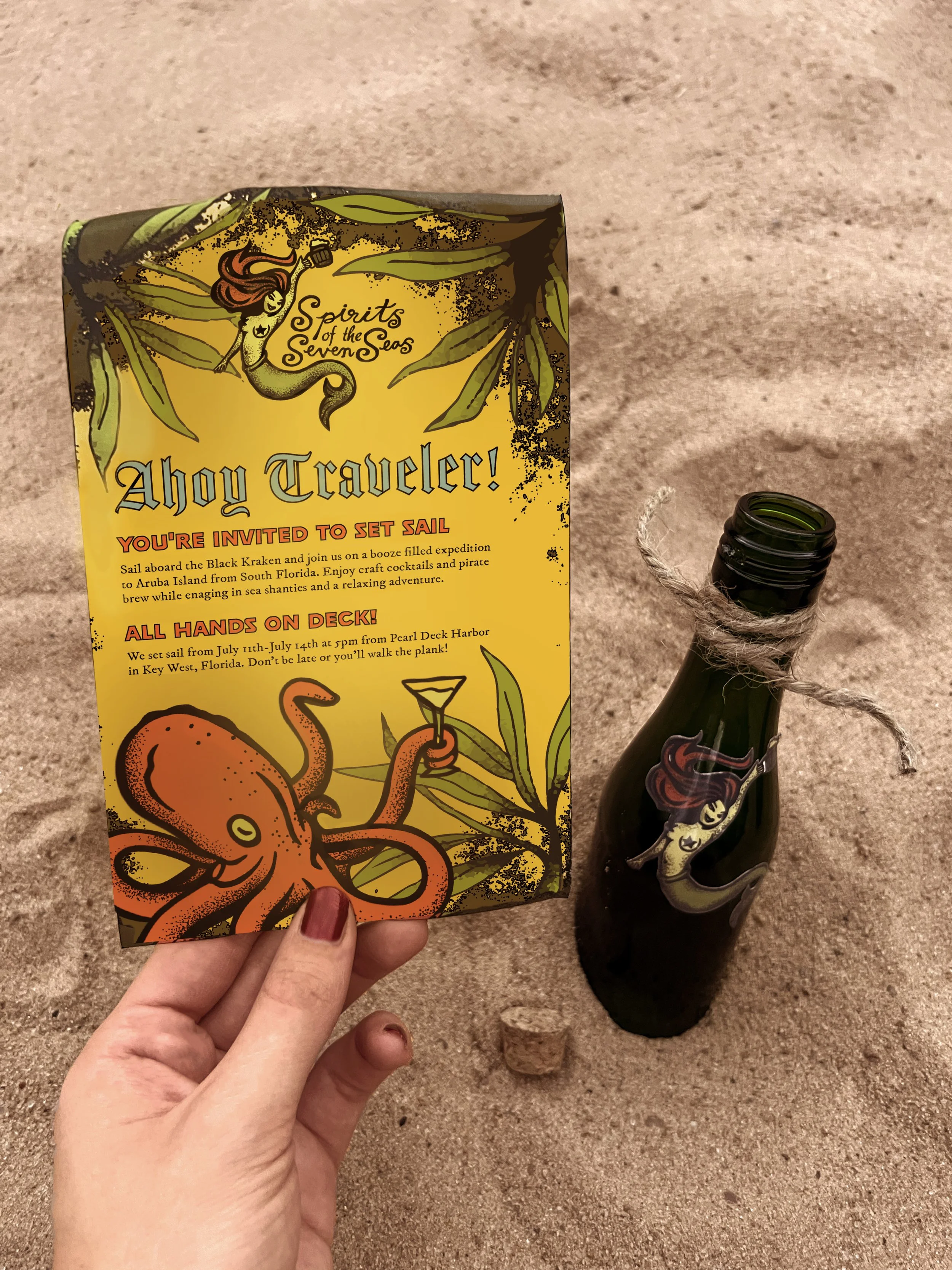 Invitation box for a fictional booze-filled sailing expedition aboard the Black Kraken. Featuring a message invitation in a bottle, rum shooters, a map of the route, and a craft cocktail menu.